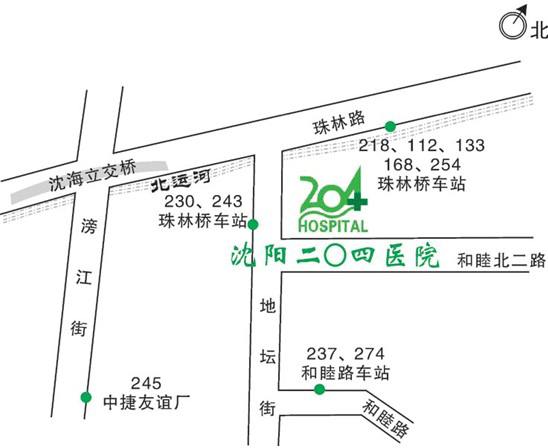 地 址:沈阳市大东区和睦北二路二号 邮 编:110043 电 话:4001-024-204 院长信箱:dly@204hsy.com 乘车路线:沈阳站:乘243路到珠林桥下车 沈阳北站北:乘230、112路到珠林桥下车 地铁乘坐路线:地铁一号线滂江街下车A出 口东走500米即是。如找详细路线可打 12580查询